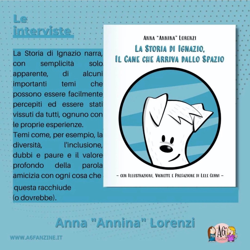 “La Storia di Ignazio, il cane che arriva dallo spazio” e la sua versione inglese, “The Story of Ace, the Dog that Comes from Space” (tradotta dall’italiano da Starleen K. Meyer), sono un Progetto “Original A19” in collaborazione con Lele Corvi. Copyright ©2021 Anna Lorenzi. Tutti i diritti riservati. Testi: Anna “Annina” Lorenzi. Copyright ©2021 Anna Lorenzi. Tutti i diritti riservati. Illustrazioni e vignette di Lele Corvi. Copyright ©2021 Gabriele Corvi. Tutti i diritti riservati.