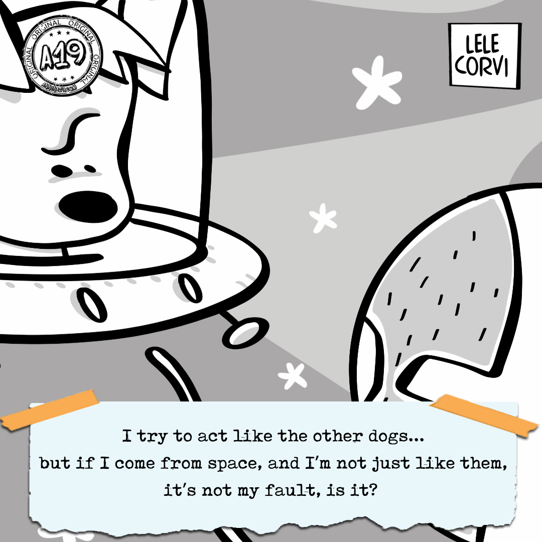 “The Story of Ace, the Dog that Comes from Space” (translated from Italian by Starleen K. Meyer), and its original title “La Storia di Ignazio, il cane che arriva dallo spazio” are an “Original A19” Project in collaboration with Lele Corvi. Copyright ©2021 Anna Lorenzi. All rights reserved. Texts: Anna “Annina” Lorenzi. Copyright ©2021 Anna Lorenzi. All rights reserved. Illustrations by Lele Corvi. Copyright ©2021 Gabriele Corvi. All rights reserved. English translation: Starleen K. Meyer